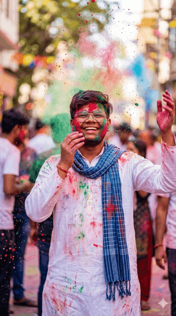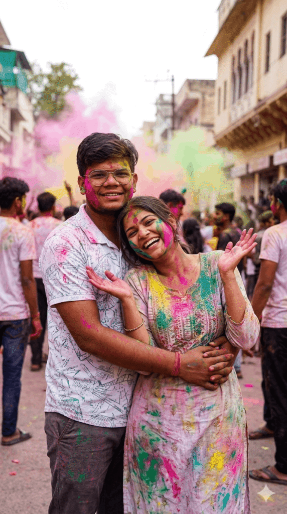 The scene may also include people in the background celebrating Holi, playing with colors and adding a lively atmosphere. Elements like a temple or a traditional street setting further enrich the composition with a subtle, colorful backdrop. The final result is a cinematic, highly realistic, and Instagram-ready Holi portrait.