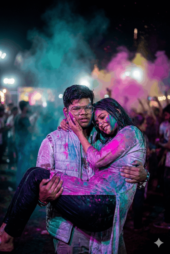 Cinematic photorealistic Holi image of same couple, him cradling her slumped form in arms like post-battle surrender, her hand on his heek weary smile, electric pinks/blues/greens on soaked outfits, mid-air color haze, bokeh festive scene, flawless face consistency, 8K vertical -ar 4:6 -v 6-style raw